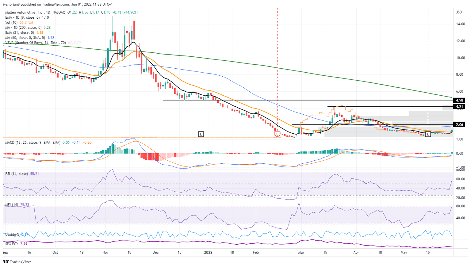 Update: Mullen Automotive (MULN) hit two-month highs of $1.67 on Wednesday, although retreated sharply to settle the day at $1.42. Despite the late pullback, the MULN stock price gained 1.43% on the day. The shares of an emerging electric vehicle (EV) manufacturer surged after the company announced results of Mullen’s solid-state polymer battery testing with the Battery Innovation Center (BIC) in Indiana. MULN shares failed to sustain at higher levels, as it felt the heat from the broader Wall Street indices. The major US indices declined after upbeat ISM Manufacturing PMI poured cold water on the aggressive Fed tightening delay optimism.