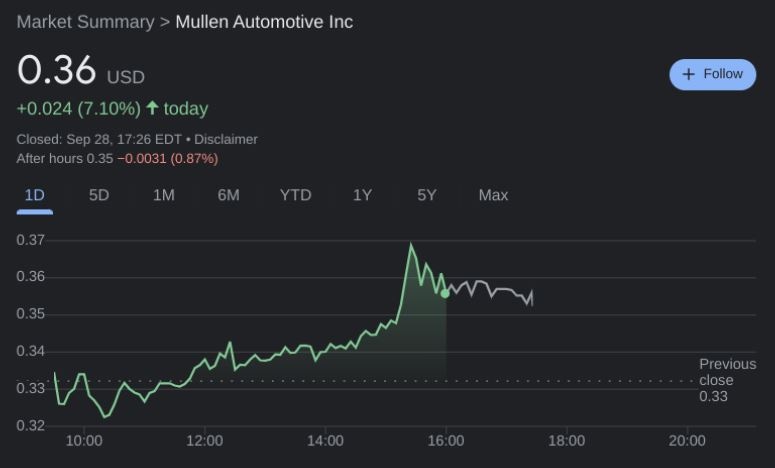 UPDATE: Wednesday's brief rally is already over. MULN stock has lost another 6.1% to trade at $0.3340. The sell-off has only gained steam as the first hour of Thursday's session comes to a close. That Nasdaq is down over 3%, a quite unusual demonstration of how few dip buyers are sticking around these days. The Dow Jones is off 1.9%, while the S&P 500 has shed 2.4%. Risky, growth and technology stocks continue to lead the way lower, and Mullen Automotive earns at least two of those monikers. The would-be EV maker is now worth just $190 million – 4,466 times smaller than Tesla (TSLA). Maybe no for long though. TSLA stock is off 5.4% as well in the first hour. So far in September, MULN stock has only gained ground in six sessions. The stock has fallen in eight out of the last 10 sessions.