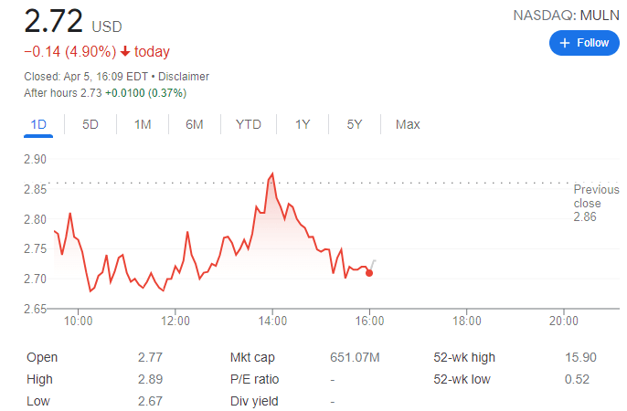 - MULN stock adds losses on Tuesday, and settles at $2.72.