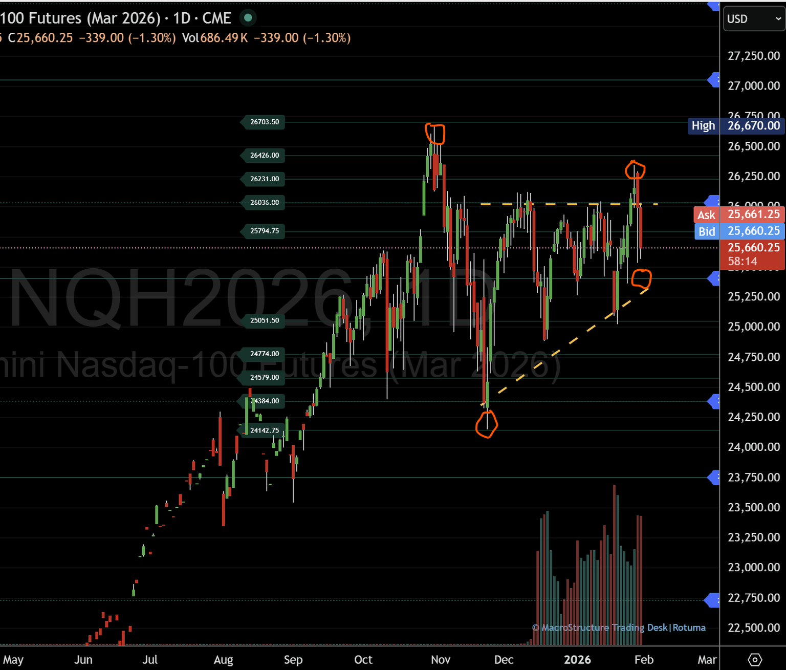Nasdaq 100 futures drop for a second session as the market heads into the end of the week, with the prior upside rotation losing traction. The breakout through the 25,794–26,036 supply band — the zone that had capped upside rotations since November 2025 — proved short-lived. As of this print, price is trading near 25,578, pulling back toward the daily central pivot at 25,405.