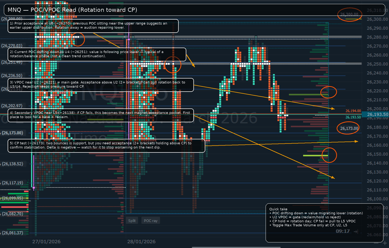 The value structure supports the idea that acceptance is migrating lower. The prior POC was anchored near ~26270 (U5), while the current POC is ~26270 (U5), while the current POCcloser to ~26251 (U4). The primary VPOC is near ~26221 (U2), which acts as the key reclaim gate inside the upper structure. A secondary VPOC is visible near ~26138 (L5), which becomes the natural magnet if the market loses balance below the central pivot.
