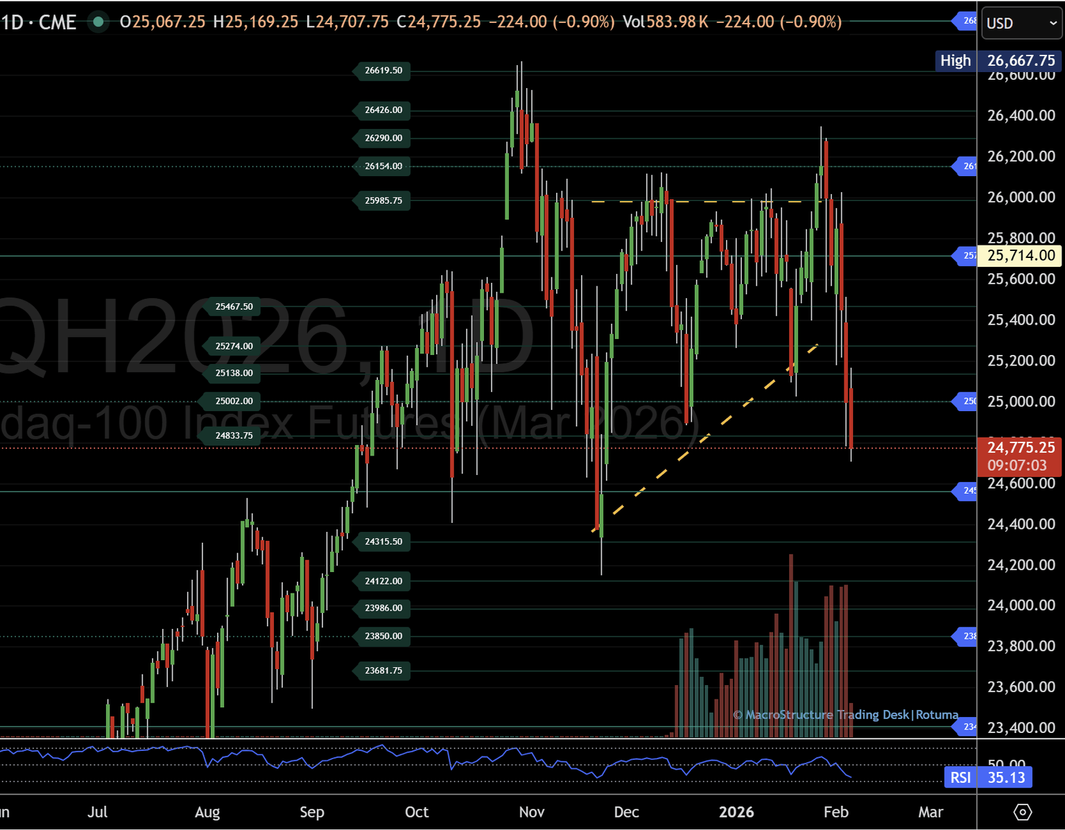 Below the floor, the next reference is 24,562. This level is less about a single tick and more about acceptance — whether the market trades below it and stays below it (time + continuation), rather than quickly snapping back into the prior range.
