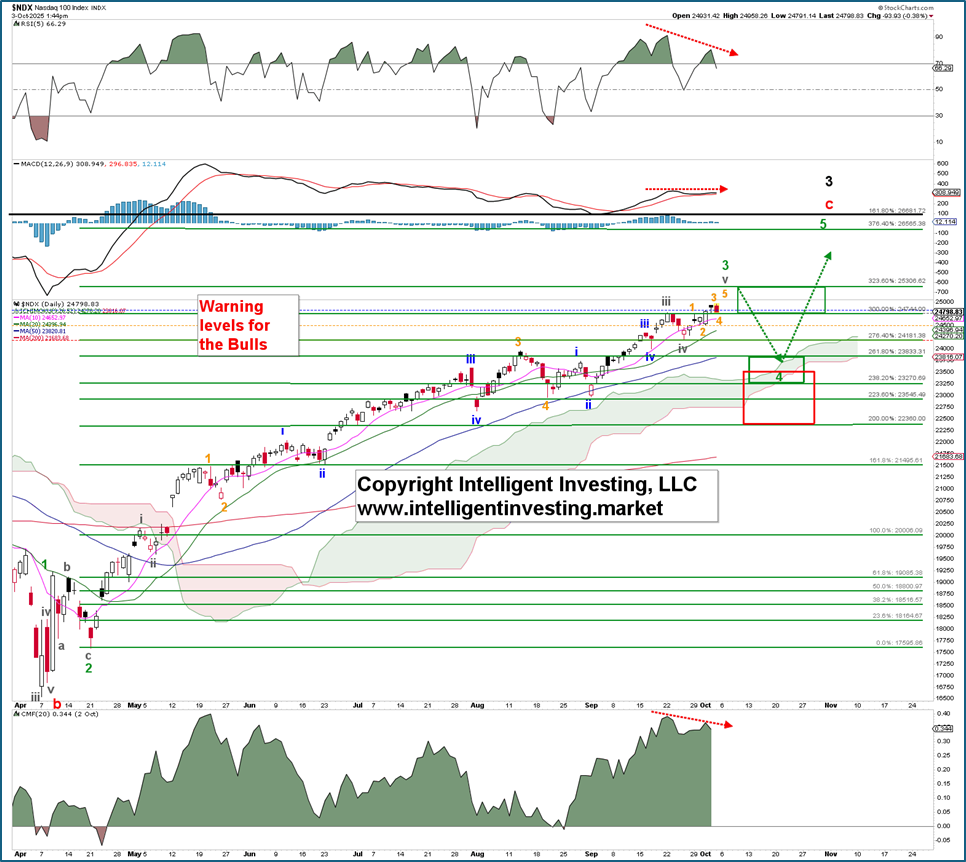 Fast forward two weeks, and the index reached 24958 today. It is perfectly within the ideal target zone and reversed intra-day. Therefore, the odds are increasing that the intermediate (green) W-3 top has been hit. See Figure 1 below.