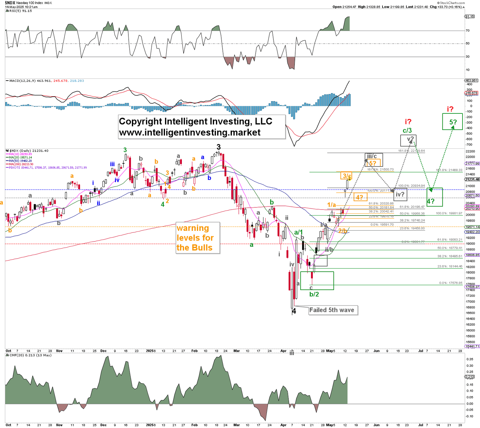 Figure 1. NDX daily chart with detailed Elliott Wave count and technical indicators