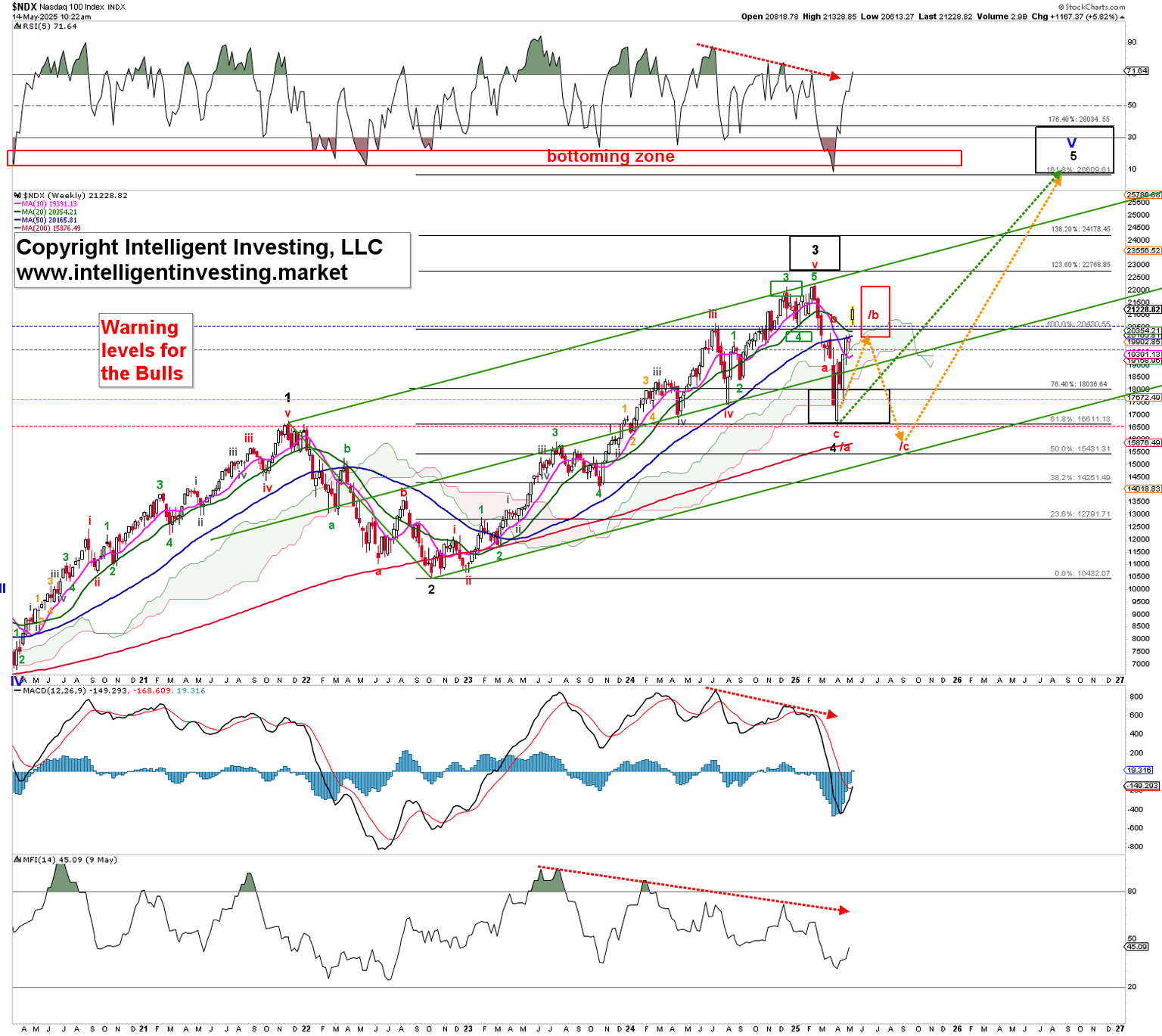 Figure 2. NDX weekly chart with detailed Elliott Wave count and technical indicators