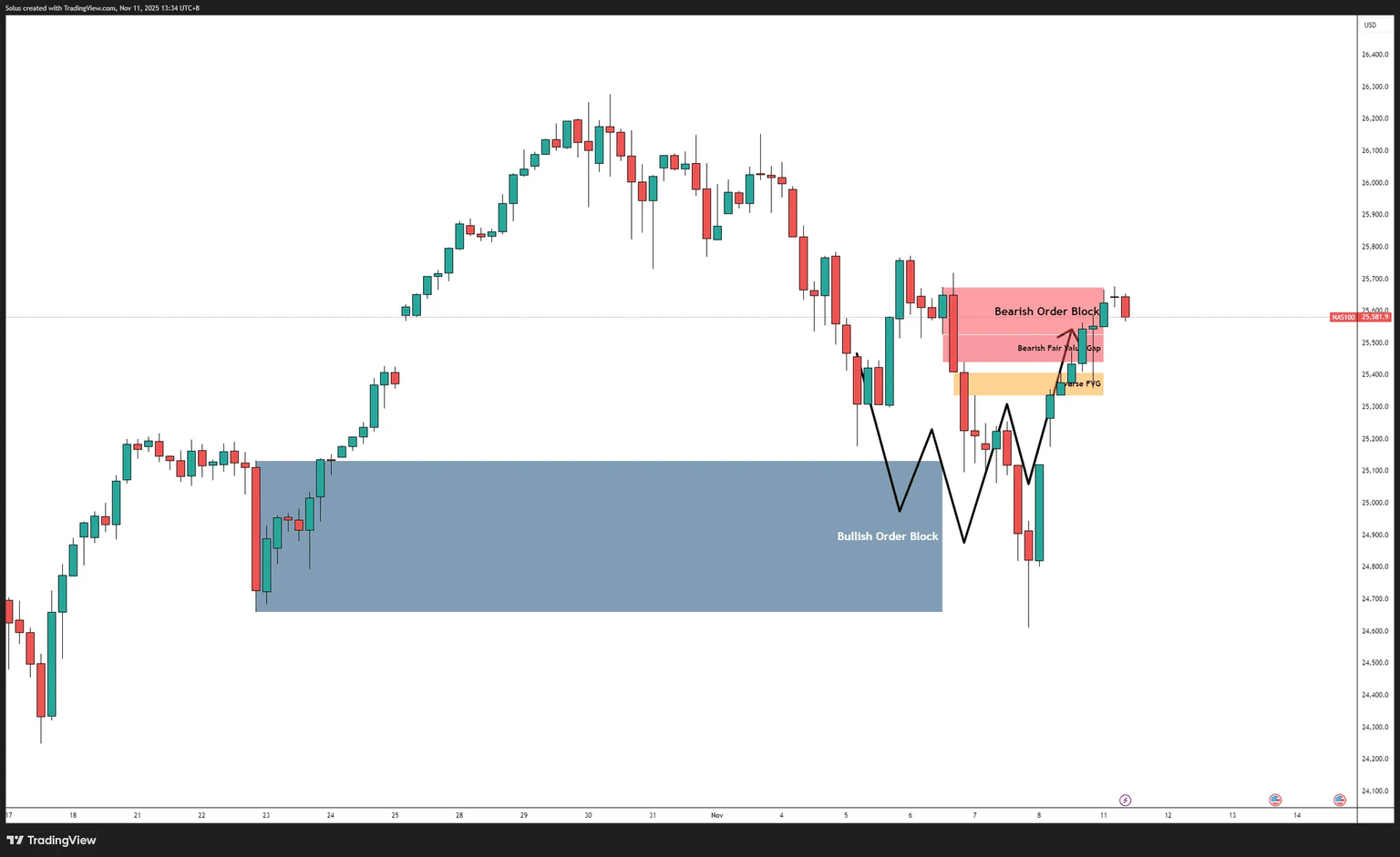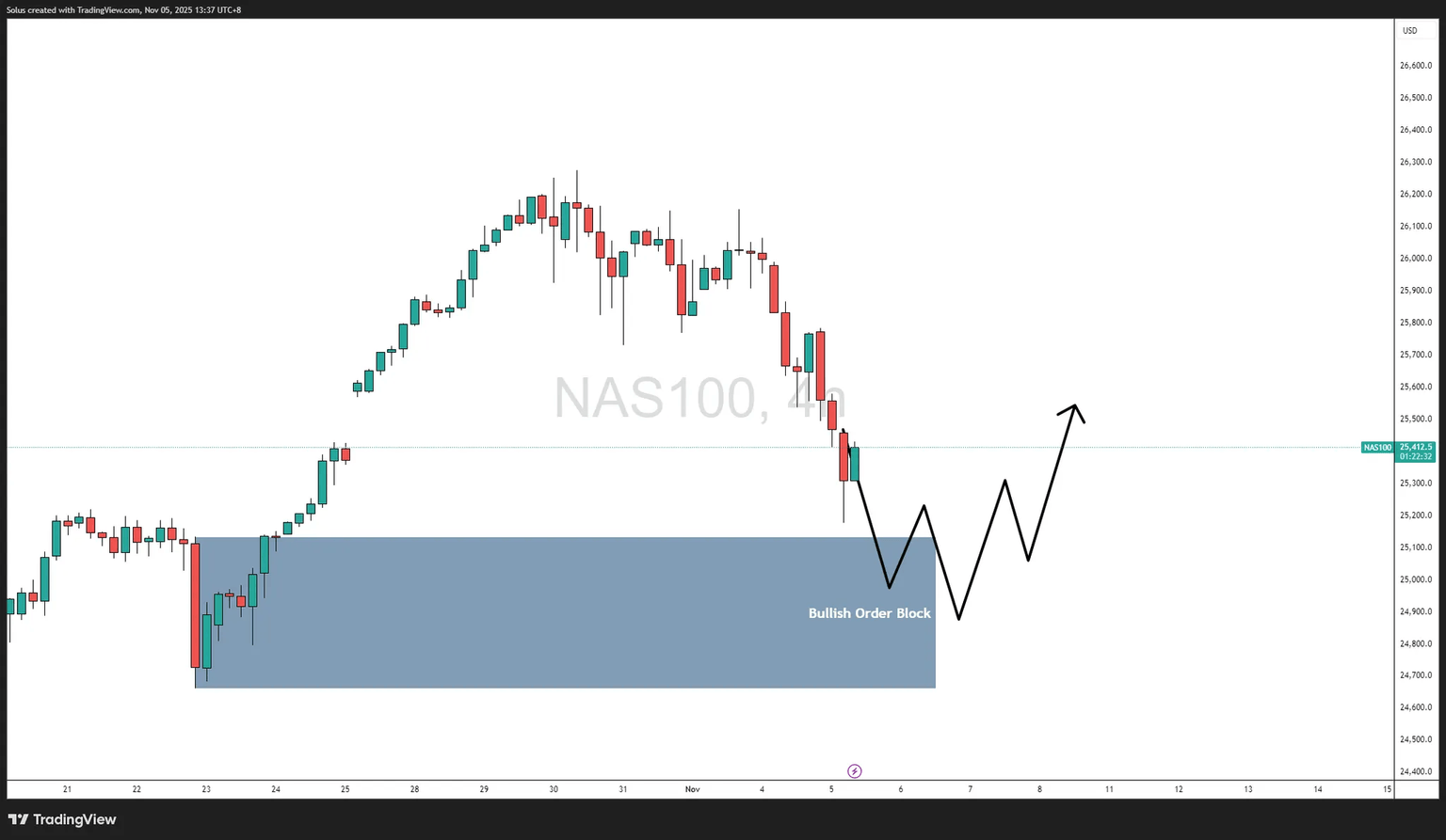 From our previous analysis on November 5, where we anticipated a pullback into the 25,400 support region as a potential accumulation zone, Nasdaq has delivered precisely that setup. After sweeping liquidity below 25,000, price reacted strongly within the bullish order block, confirming the area as active institutional demand.