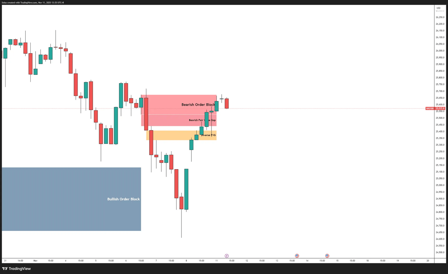 - A rejection at the bearish order block (25,600–25,700) could invite renewed selling.