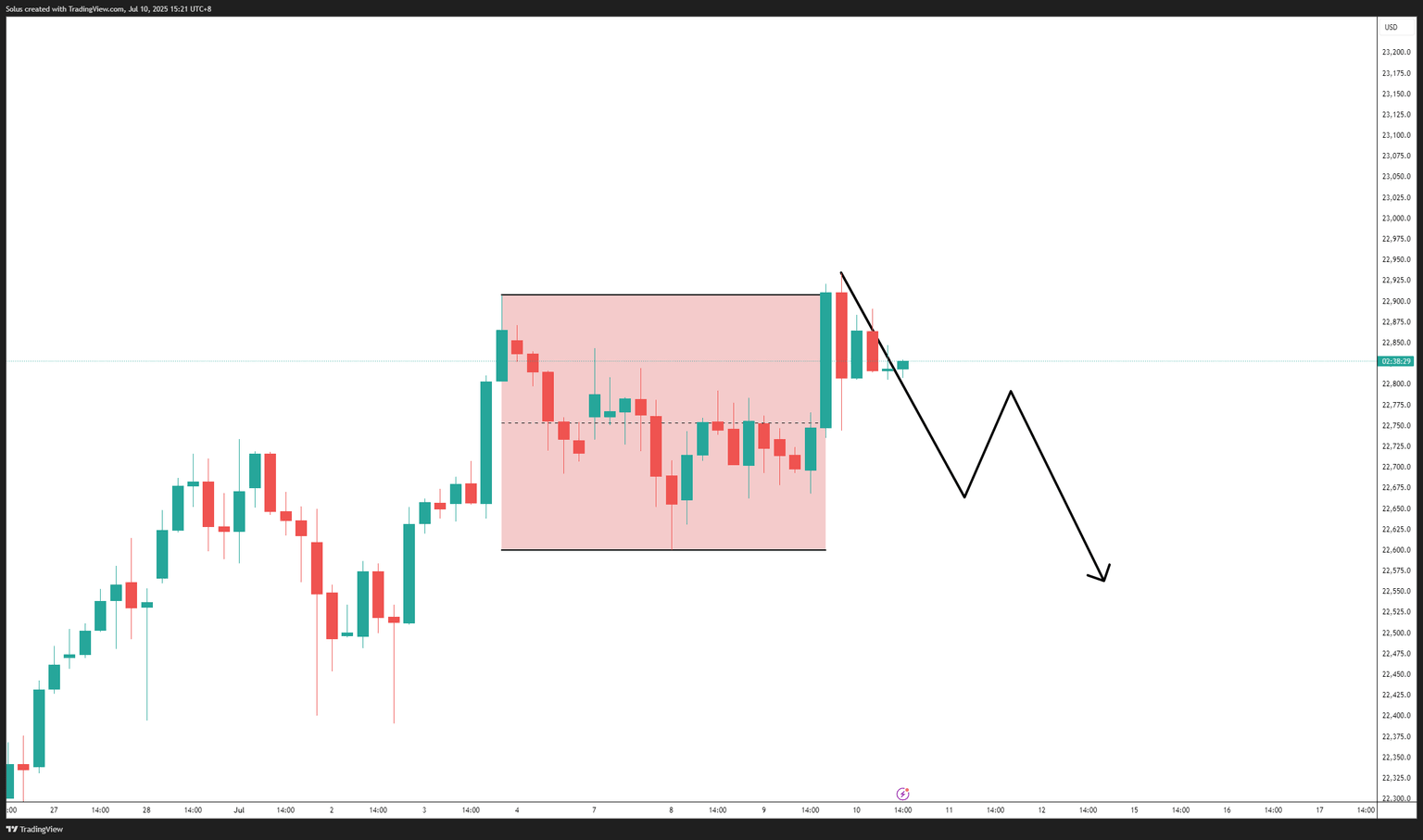 - Price breaks down and closes below 22,750.