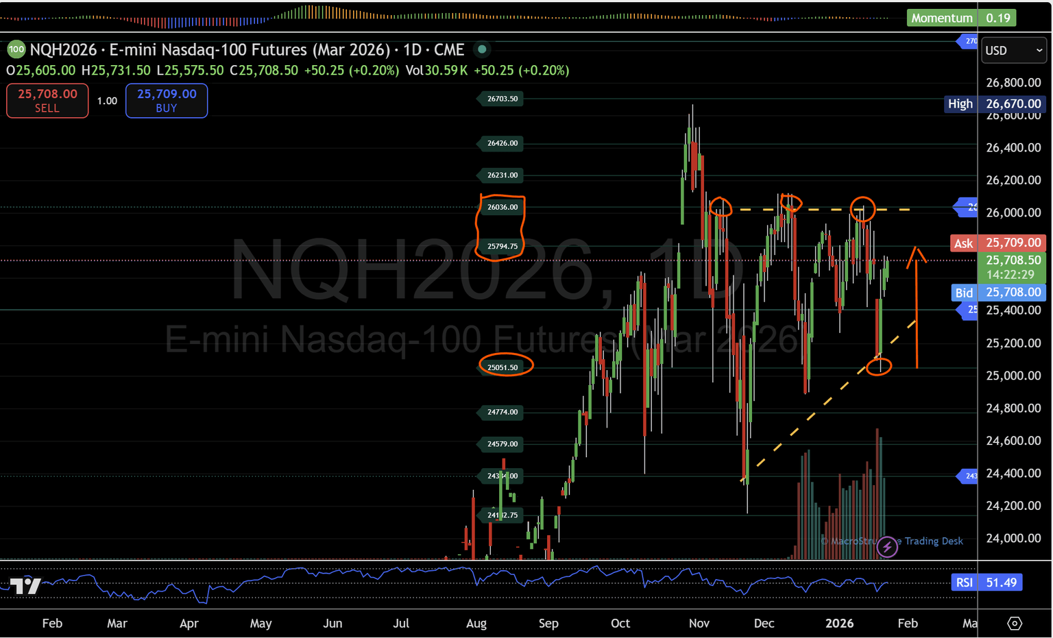 This update follows the January 14 desk report, where price failed to complete a rotation through the upper structure after another rejection at 26036 on the daily timeframe.