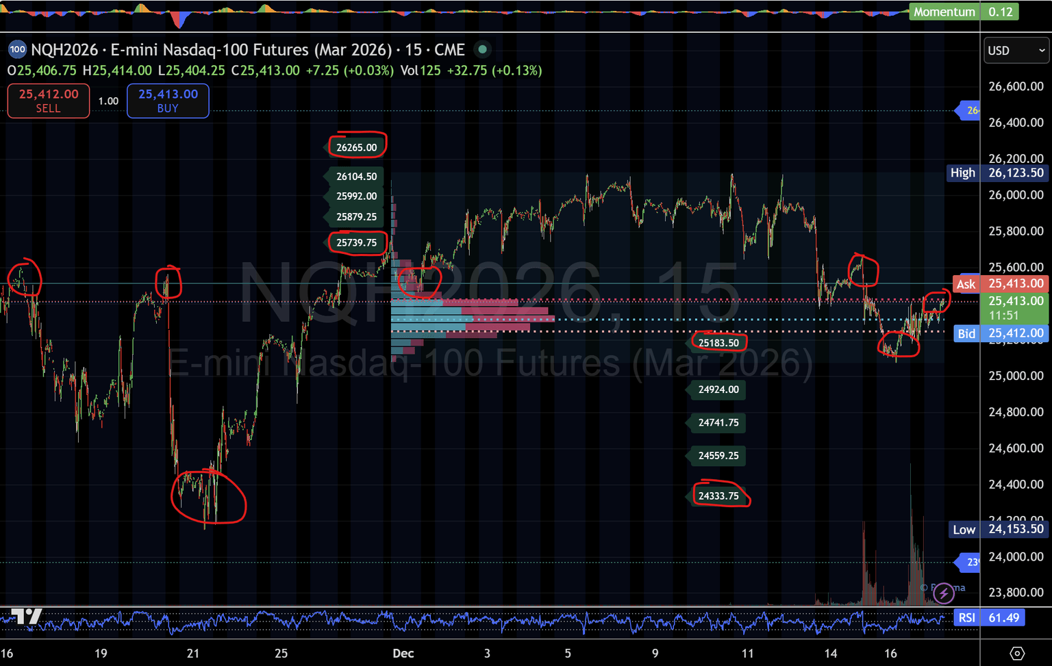 Nasdaq March futures continue to trade within a well-defined, two-way structural environment across both daily and intraday timeframes. Rather than directional conviction, the market is offering clear rotational behaviour around known reference levels.