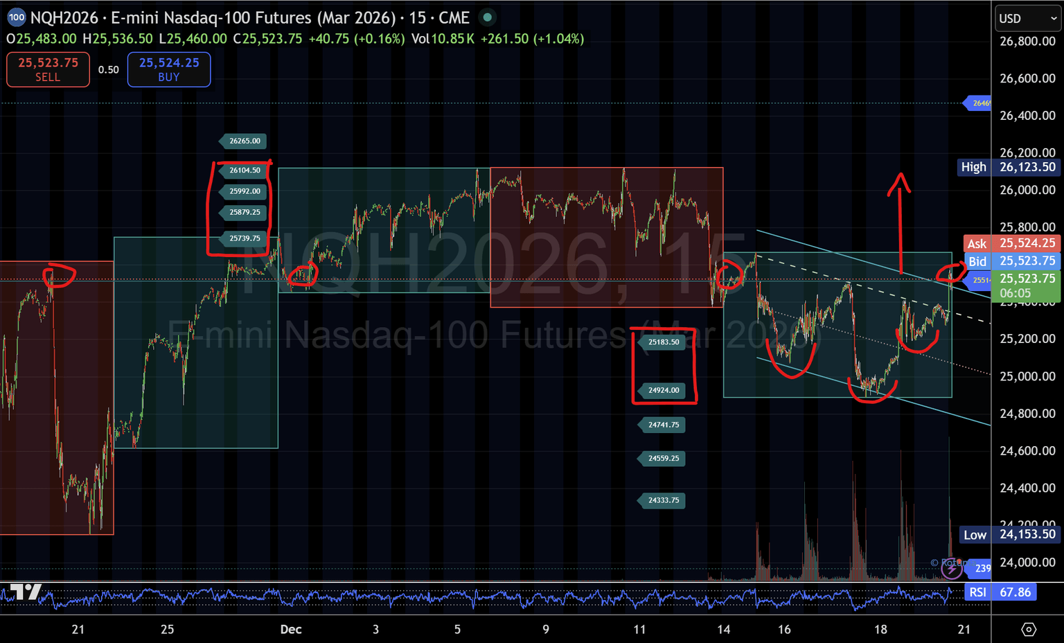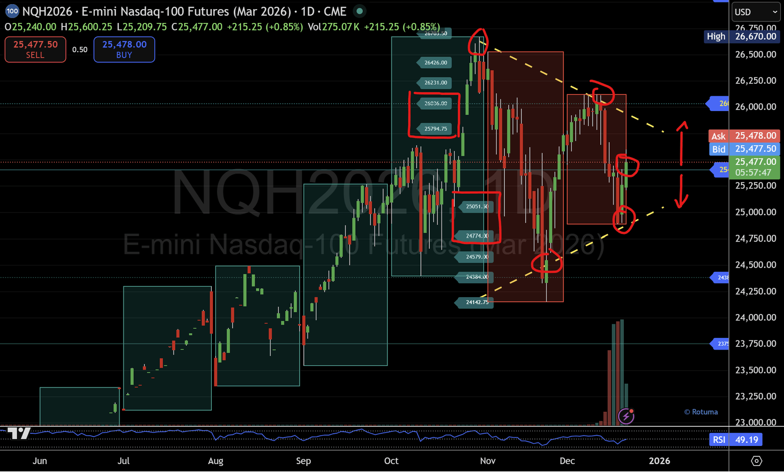 The next phase of rotation will be dictated by acceptance or rejection around the central pivots, with structure continuing to define the battlefield as the market works through late-December conditions.