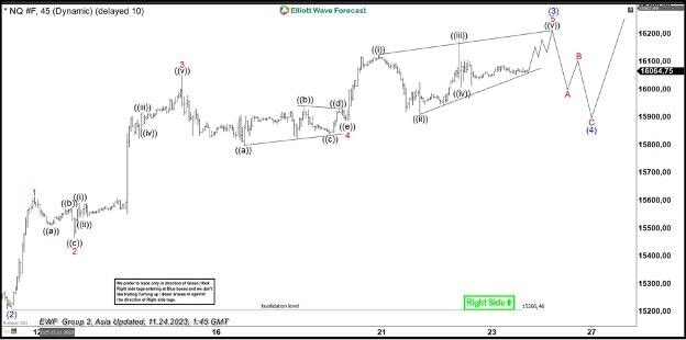Short term Elliott Wave in Nasdaq Futures (NQ_F) shows cycle from October 27, 2023 low is unfolding as a 5 waves impulse. This cycle is mature even though it still can extend higher in the shorter cycle. Up from October 27 low, wave (1) ended at 15453.75 and pullback in wave (2) ended at 15207.75. The Index then extended higher in wave (3). Up from wave (2), wave 1 ended at 15612.75 and wave 2 ended at 15465.25.