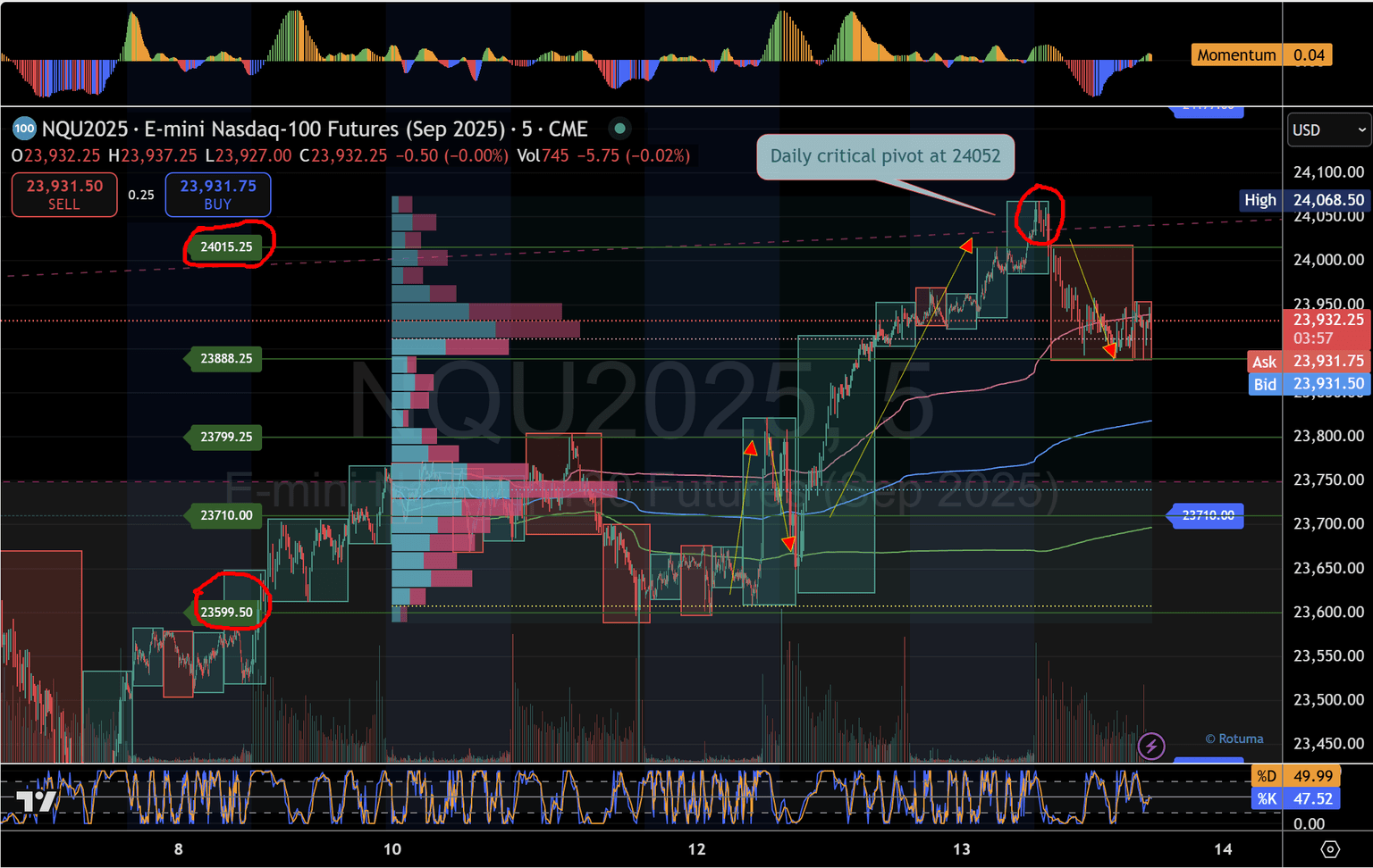 - Keep a 15m/1h/4h/daily lens on structure and VWAP/volume profile. A daily close above 24,052 would confirm a fresh leg higher; a close back below 23,888 shifts bias to mean-reversion toward 23,710/23,599.