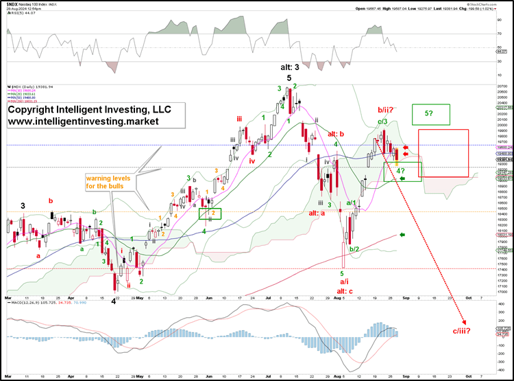 Lastly, going back to Figure 1, the bears do not want to see the index break above last week’s high, as that would put five (green) waves on the chart instead of three. Namely, that would mean the August 5 low was the black “alt: 4” low, as shown in Figure 2. Thus, although our target zone outlined in early August for this (retracement) rally has been reached, and our preferred long-term view is that of a significant top being in place since July, the Bears still have more work to do before they can declare victory.