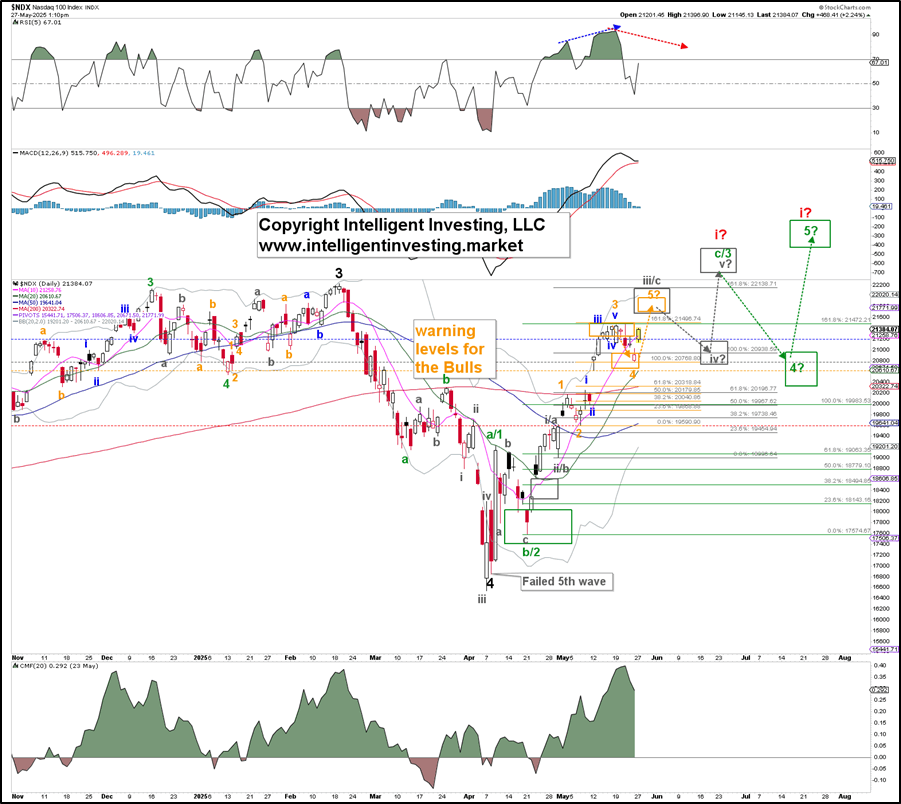 Figure 1. NDX daily chart with detailed Elliott Wave count and technical indicators