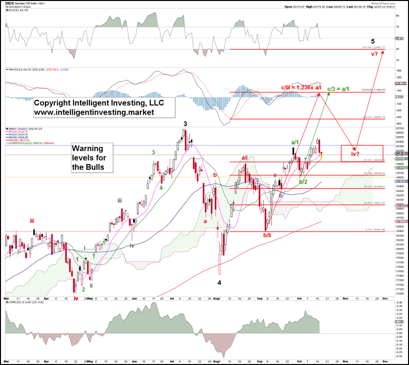 Figure 1. NDX daily chart with detailed Elliott Wave count and technical indicators