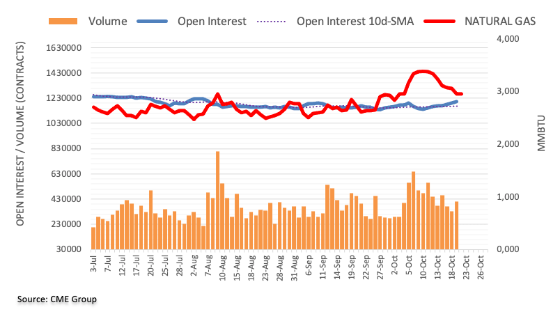 Prices of natural gas retreated for the seventh consecutive session on Thursday, shedding ground uninterruptedly since monthly highs near $3.50 (October 9). The move was in tandem with rising open interest and volume and favours the continuation of this corrective move for the time being. The loss of the key $3.00 mark per MMBtu should open the door to extra losses.