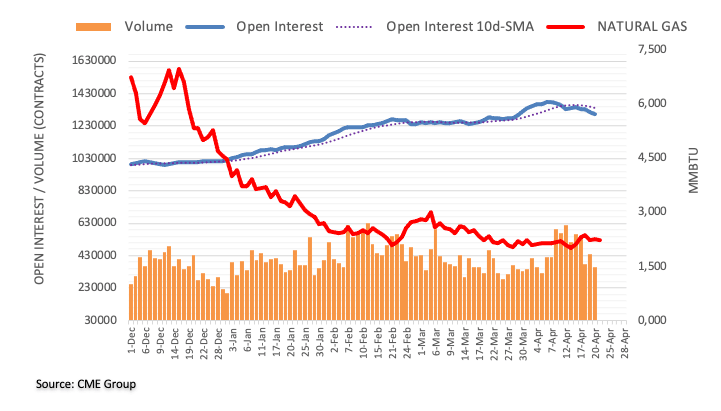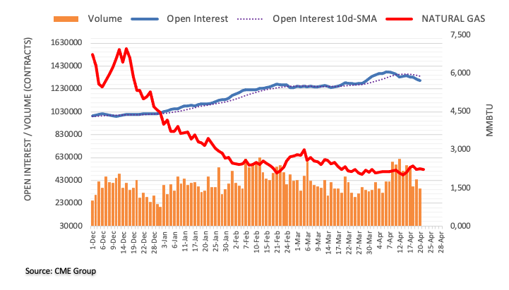 Considering advanced figures from CME Group for natural gas futures markets, open interest dropped for the fourth consecutive session on Thursday, now by around 11.3K contracts. Volume followed suit and resumed the downtrend, now declining by around 82.3K contracts.