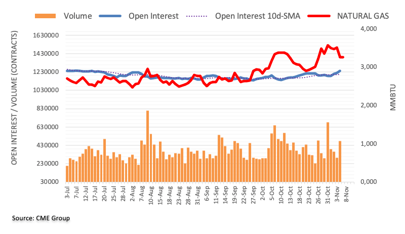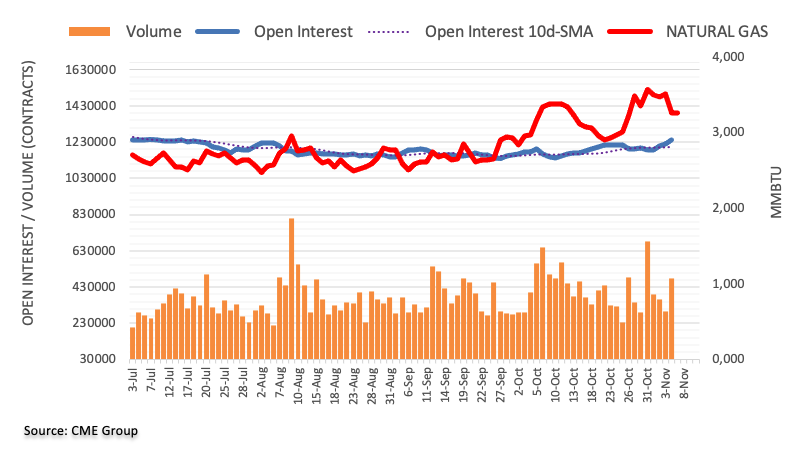 Prices of natural gas extended the corrective decline on Monday against the backdrop of increasing open interest and volume, allowing for the continuation of the ongoing decline in the very near term. That said, the next support is now seen at the mid-October lows around the $2.90 region per MMBtu.
