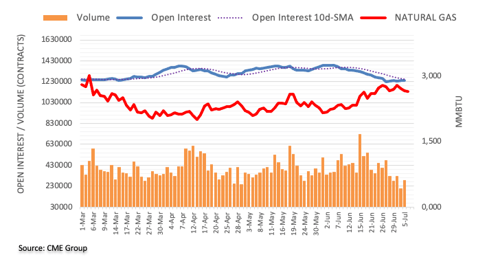 CME Group’s flash data for natural gas futures markets noted traders added just 469 contracts to their open interest positions on Wednesday, reaching the second consecutive daily build. In the same direction, volume went up by around 82.2K contracts, partially reversing the previous strong pullback.