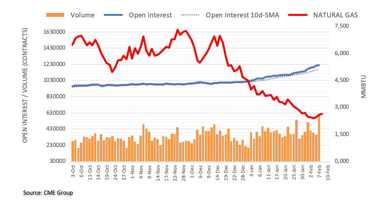 Considering advanced figures from CME Group for natural gas futures markets, open interest remained on the rise on Tuesday, this time by around 8.8K contracts. Volume followed suit and increased by around 260.2K contracts after three consecutive daily pullbacks.