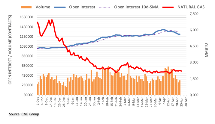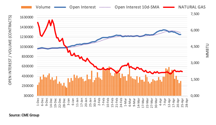 In light of advanced prints from CME Group for natural gas futures markets, open interest extended the downtrend and shrank by 880 contracts on Monday. On the other hand, volume reversed two consecutive daily drops and rose by around 42.3K contracts.
