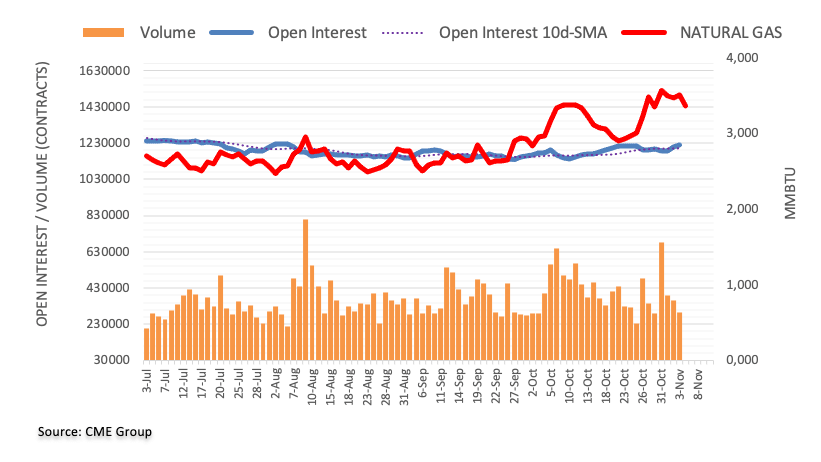 Considering advanced prints from CME Group for natural gas futures markets, open interest rose for the third session in a row on Friday, now by nearly 8K contracts. Volume, instead, shrank for the third straight session, this time by around 67.9K contracts.