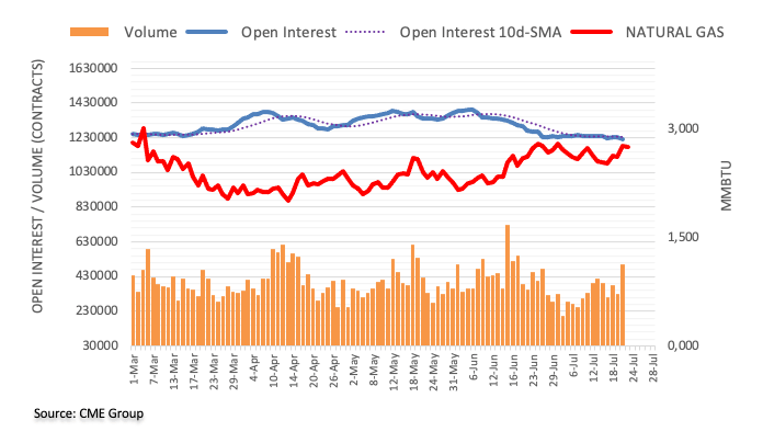 Prices of natural gas rose markedly and approached the key $2.80 region on Thursday. The daily gains, however, were amidst diminishing open interest and hints at the idea that a correction could be in store for the commodity in the very near term. In the meantime, there is a solid up-barrier at the June peak of $2.878 (June 28) ahead of the March high at $3.02 per MMBtu (March 3).