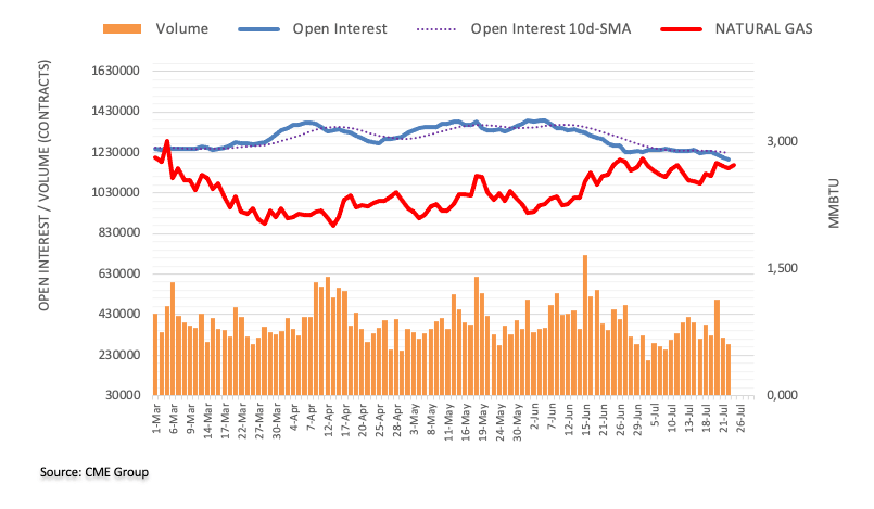 Monday’s second daily pullback in prices of natural gas was on the back of diminishing open interest and volume, hinting at the probability that a near-term rebound could be in the offing. Against that, the next target for the commodity is expected at the June tops near the $2.90 mark per MMBtu (June 28).