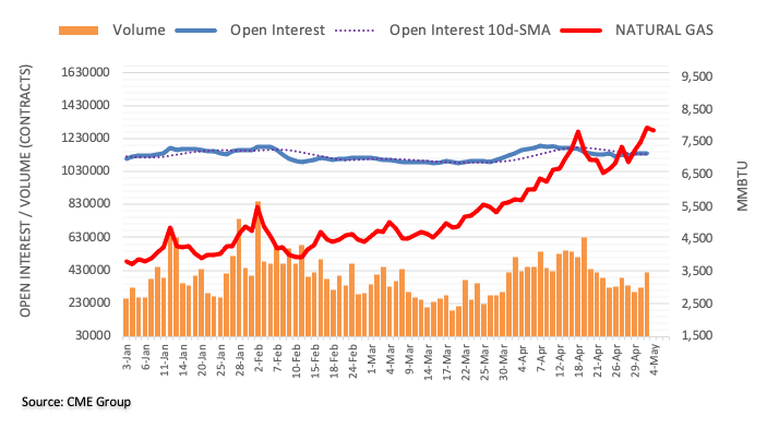 Considering preliminary figures from CME Group for natural gas futures markets, open interest rose by more than 1K contracts on Tuesday, while volume followed suit and rose for the second straight session, this time by around 91.2K contracts.