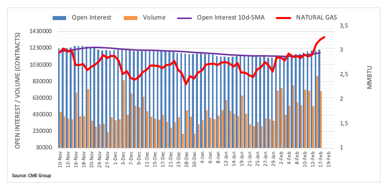 Natural gas prices seem comfortable above the key $3.00 mark, helped by the cold weather and the uptrend in open interest. While diminishing volume could slow the pace of the expected upside, the next target still emerges at the 2020 high around the $3.40 level per MMBtu (October 30).