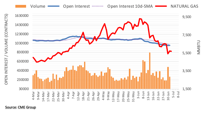 Natural gas prices charted an inconclusive session on Friday, navigating around the 200-day SMA near $5.60 following the sharp pullback recorded on June 30. Shrinking open interest and volume amidst the current lack of direction in the commodity could be the prologue to some consolidative phase around current levels.