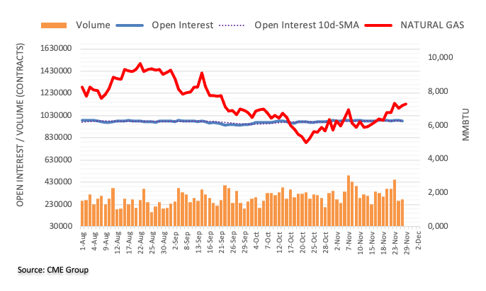 Considering advanced figures from CME Group for natural gas futures markets, open interest shrank for the second session in a row on Monday, now by just 709 contracts. Alternatively, volume remained erratic and went up by around 16.8K contracts.