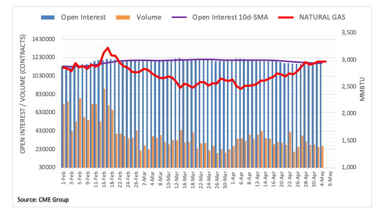 Open interest in Natural Gas futures markets rose for the fifth session in a row on Tuesday, now by nearly 10K contracts considering advanced prints from CME Group. Volume followed suit and went up by around 8.7K contracts, partially reversing the previous drop.