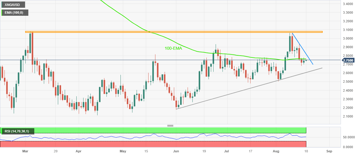 Amid this plays, the XNG/USD is likely to extend the latest rebound towards crossing the 100-EMA hurdle surrounding $2.76. However, a downward-sloping resistance line from August 10, around $2.82 by the press time, restricts the further advances of the Natural Gas Price.