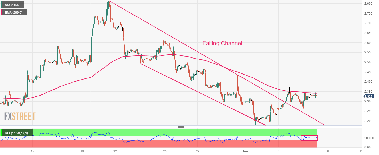Natural Gas price has shifted into a bullish trajectory after a breakout of the Falling Channel chart pattern formed on an hourly scale. The energy instrument is struggling to surpass the immediate resistance plotted around $2.35.