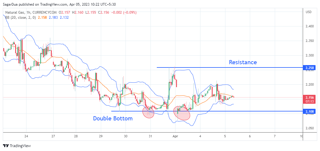 Natural Gas futures have shown a decent recovery after defending further downside near 2.10 on an hourly scale. The asset has formed a Double Bottom chart pattern, which indicates a bullish reversal after a long period of a downside journey. Potential resistance is placed from March 31 high at $2.26.