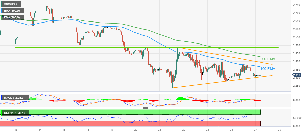 Natural Gas (XNG/USD) price remains on the back foot around $2.31 as bears take a breather after a three-week losing streak inside a short-term symmetrical triangle.