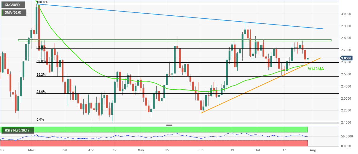The XNG/USD downside, however, failed to conquer an upward-sloping support line from late May, around $2.58 by the press time.