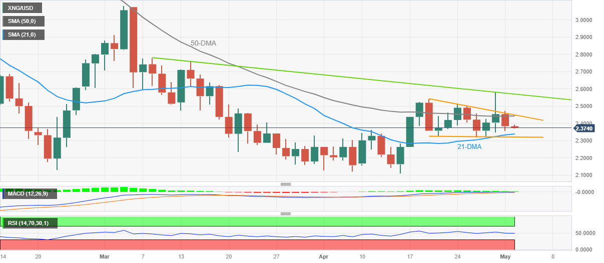 On the contrary, the 21-DMA level of around $2.33 restricts the immediate downside of the XNG/USD price before directing the energy instrument towards the bottom of the stated triangle, near $2.32.