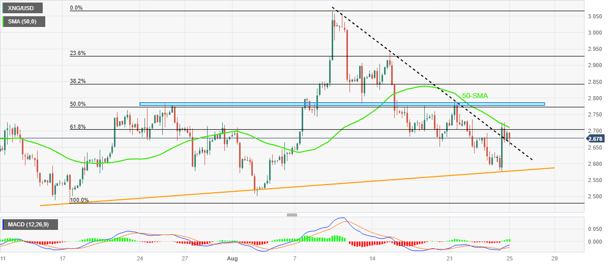 That said, the XNG/USD bounced off a 1.5-month-old rising support line the previous day before reversing from the 50-SMA upside hurdle. The pullback moves, however, fail to break the resistance-turned-support line stretched from August 10, close to $2.66 by the press time.