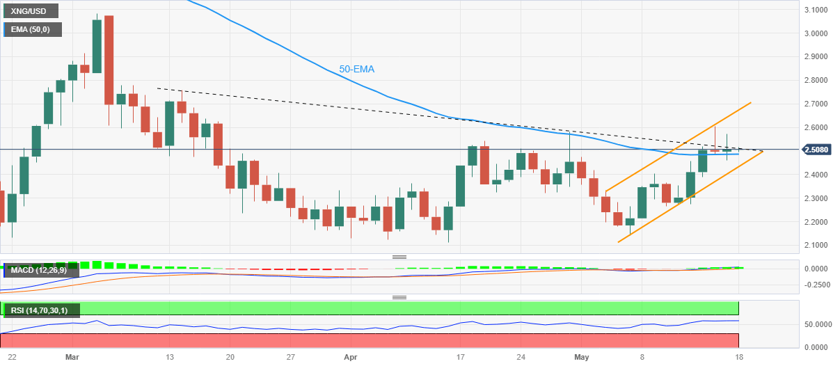 Natural Gas Price Analysis: XNG/USD grinds between 50-EMA and crucial resistance line near $2.50