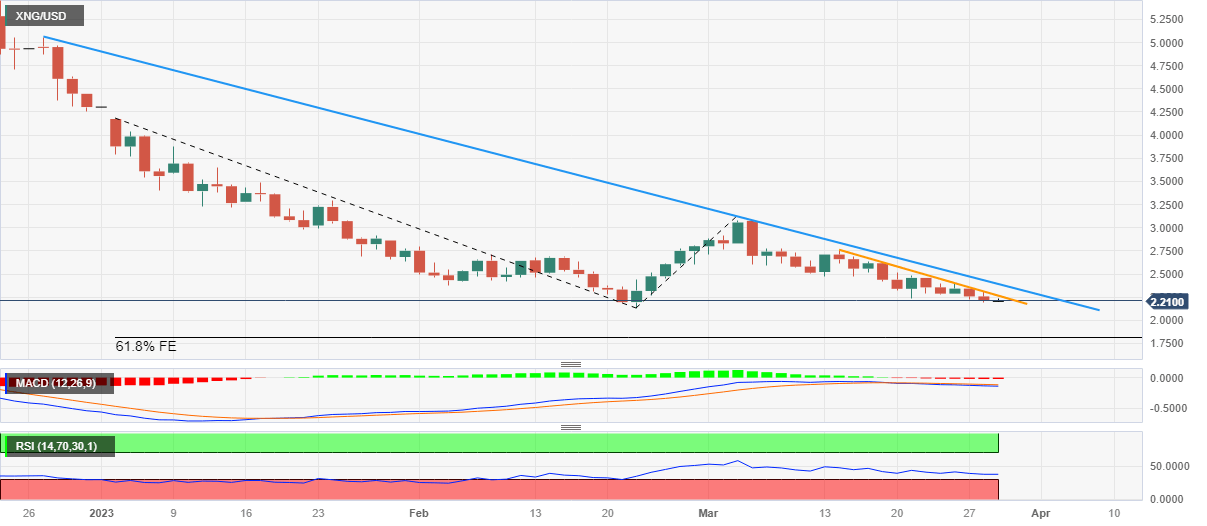 Natural Gas (XNG/USD) holds lower ground near $2.20 as bears poke the Year-To-Date (YTD) low marked in February. In doing so, the energy quote remains sluggish after declining in the last two consecutive days.