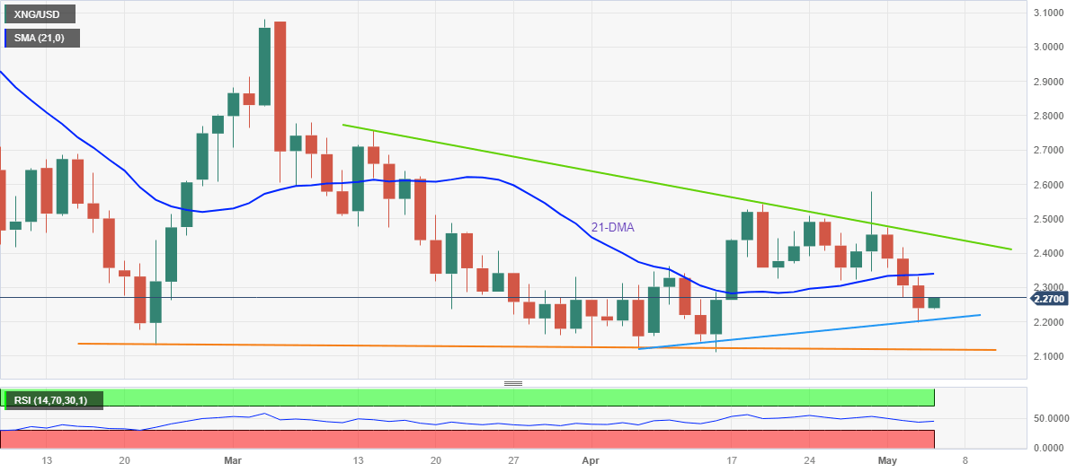 Meanwhile, a downside break of the aforementioned one-month-old support line, close to $2.20, can quickly drag the XNG/USD quote towards a broad support line stretched from late February, around $2.12.