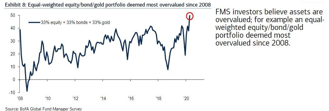 The percentage of global fund managers who believe most asset classes are overvalued has risen to nearly 50% – the highest level since 2008, according to a Bank of America (BofA) fund manager survey released on Tuesday.