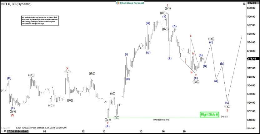 Short term Elliott Wave View in Netflix (NFLX) suggests that cycle from 12.6.2023 low is in progress as a 5 waves impulse Elliott Wave structure. Up from 12.6.2023 low, wave (1) ended at 500.89 and wave (2) dips ended at 461.86. The stock extended higher in wave (3) towards 579.64 and pullback in wave (4) ended at 548.93 as the 30 minutes chart below shows. Internal subdivision of wave (4) unfolded as a double three. Wave W ended at 554.37 and wave X ended at 589.50. Wave Y lower ended at 548.93 which completed wave (4).