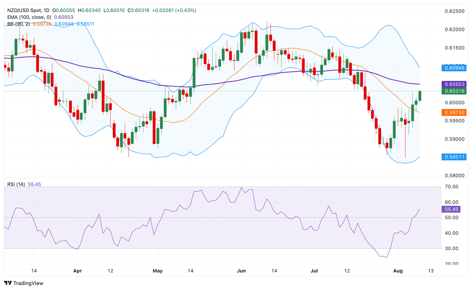 The 100-period EMA near 0.6050 could act as a potential upside barrier for NZD/USD. If the price manages to break above this level, it would indicate the possibility of further upside. The next hurdle is seen at 0.6112, the upper boundary of the Bollinger Band.