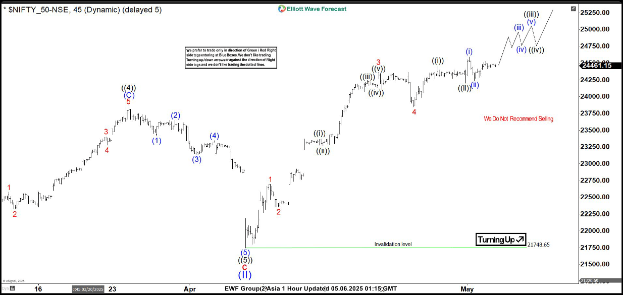 The Nifty Index has staged a notable recovery after a selloff that began on September 27, 2024, from a high of 21,748.65. We label this decline as wave (II), and the index has since turned upward. However, to confirm that the correction is over and avoid a potential double correction, the index must break above its previous peak of 26,277.35. The rally from the wave (II) low is expected to unfold as a five-wave impulse structure, a pattern commonly analyzed in Elliott Wave theory.