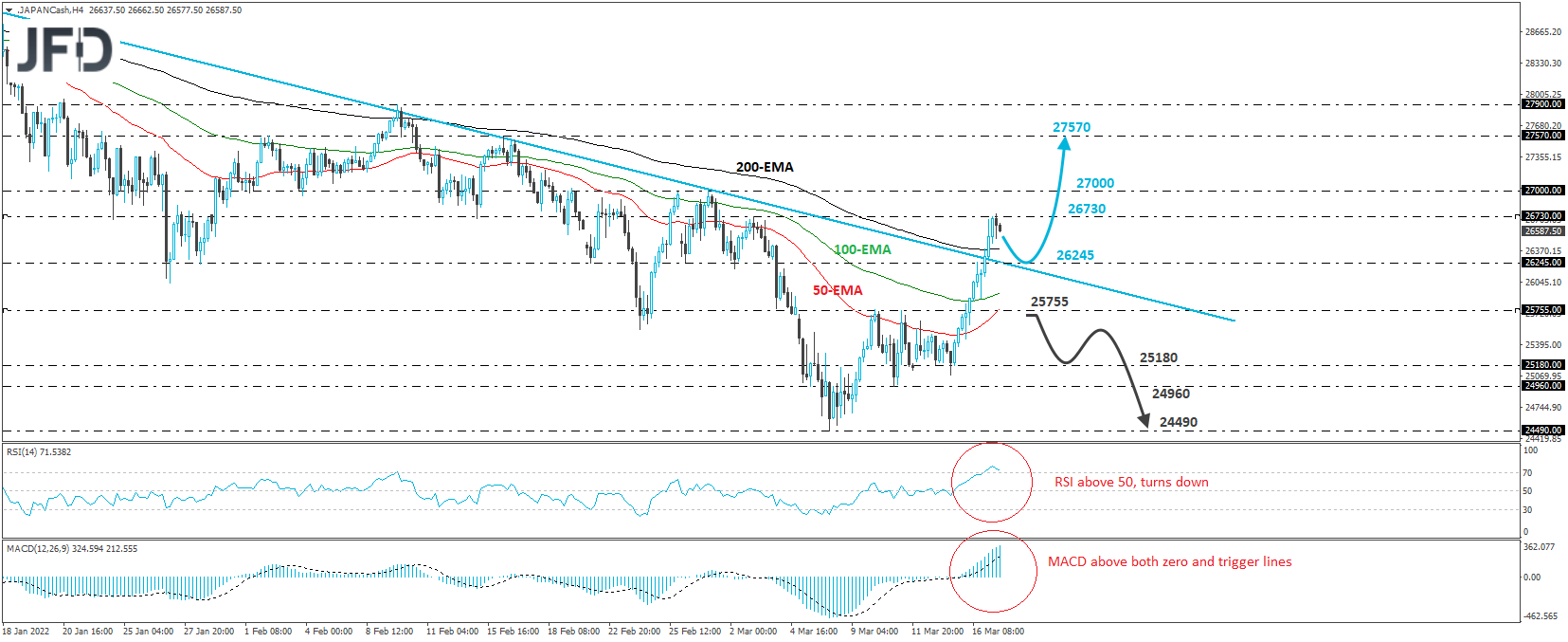 The Nikkei 225 cash index has been in a rally mode since March 15th, when it hit support near the 25180 zone. Overnight, during the Asian session today, the rally took the index above the downside resistance line drawn from the high of January 5th, and although it paused near the 26730 zone, it stayed above that line. Thus, we will consider the short-term outlook to have turned cautiously positive for now.
