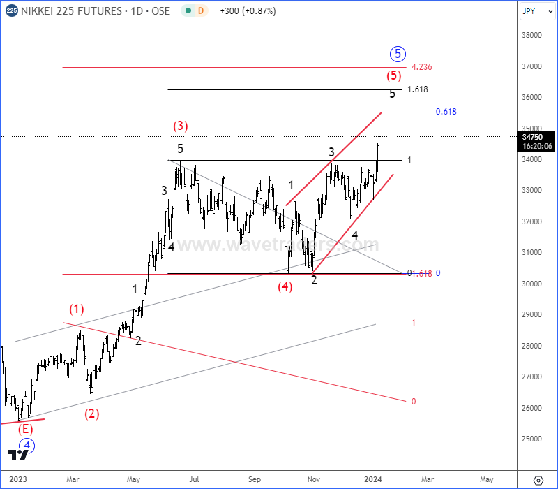 NIKKEI225 is coming higher as expected, but this can be now final stages of 5th wave of different degrees. However, there can be still space up to 35k-36k and Fibo. cluster target area before a reversal down.